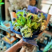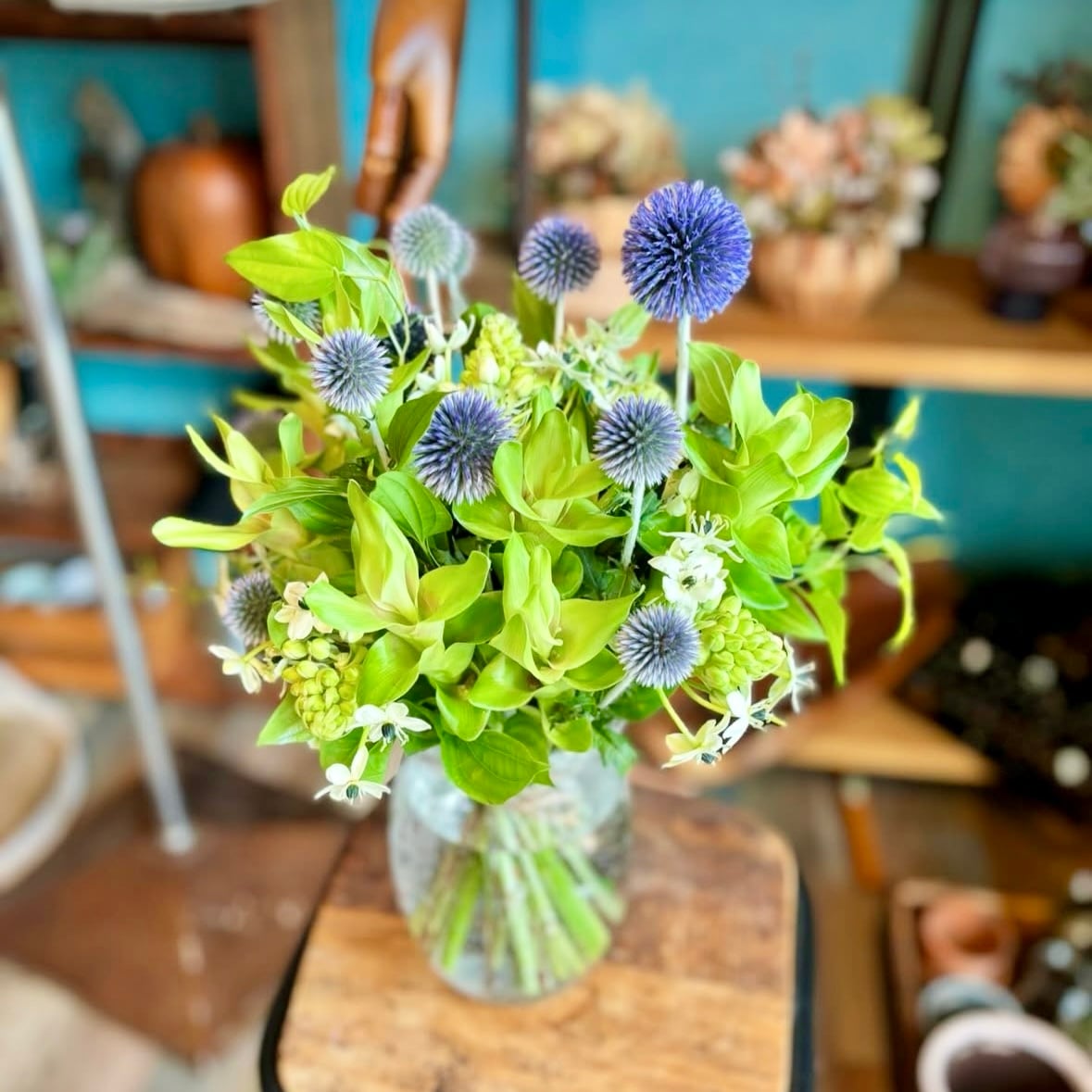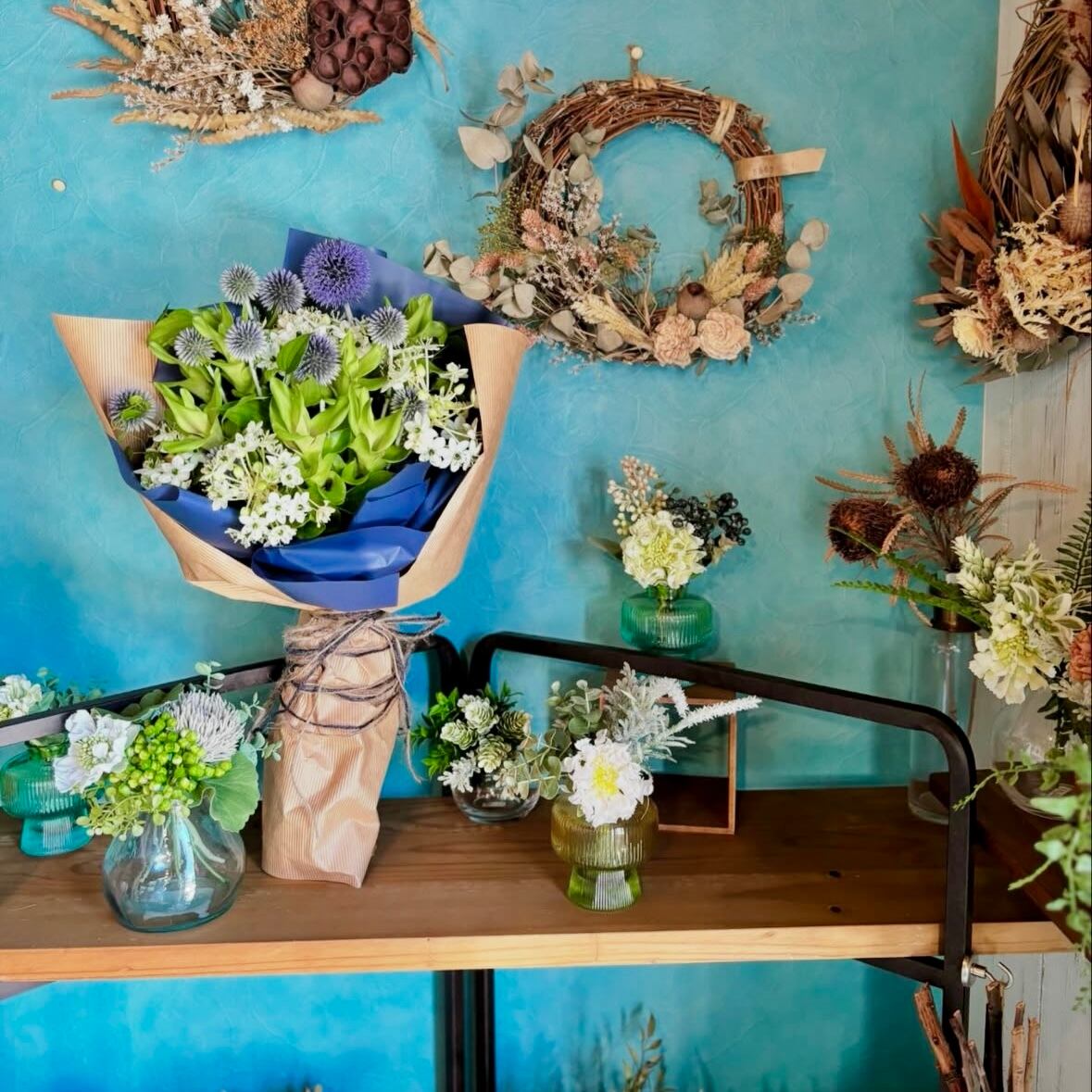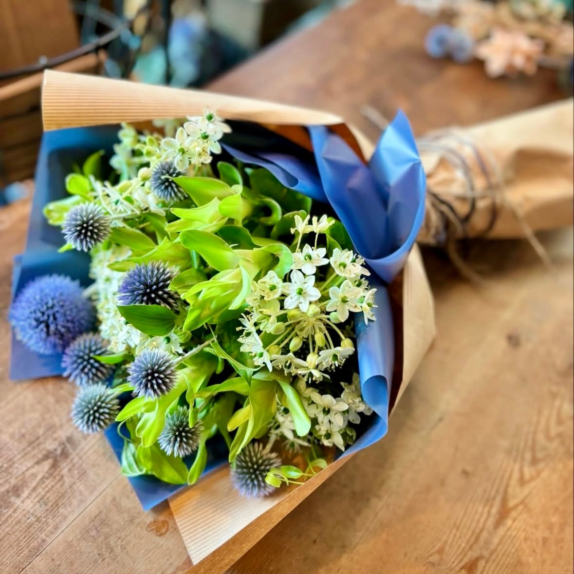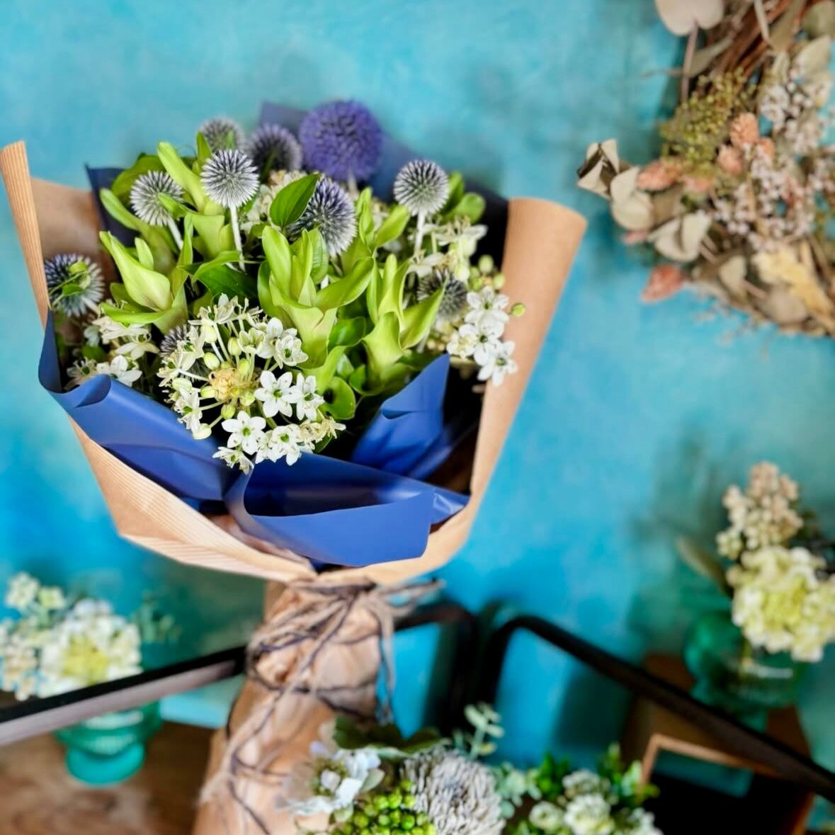 『ブルー・グリーン』をテーマにしたブーケは、青と緑の色合いが絶妙に調和し、まるで夏の爽やかな風を感じるようなナチュラルな雰囲気を醸し出します。